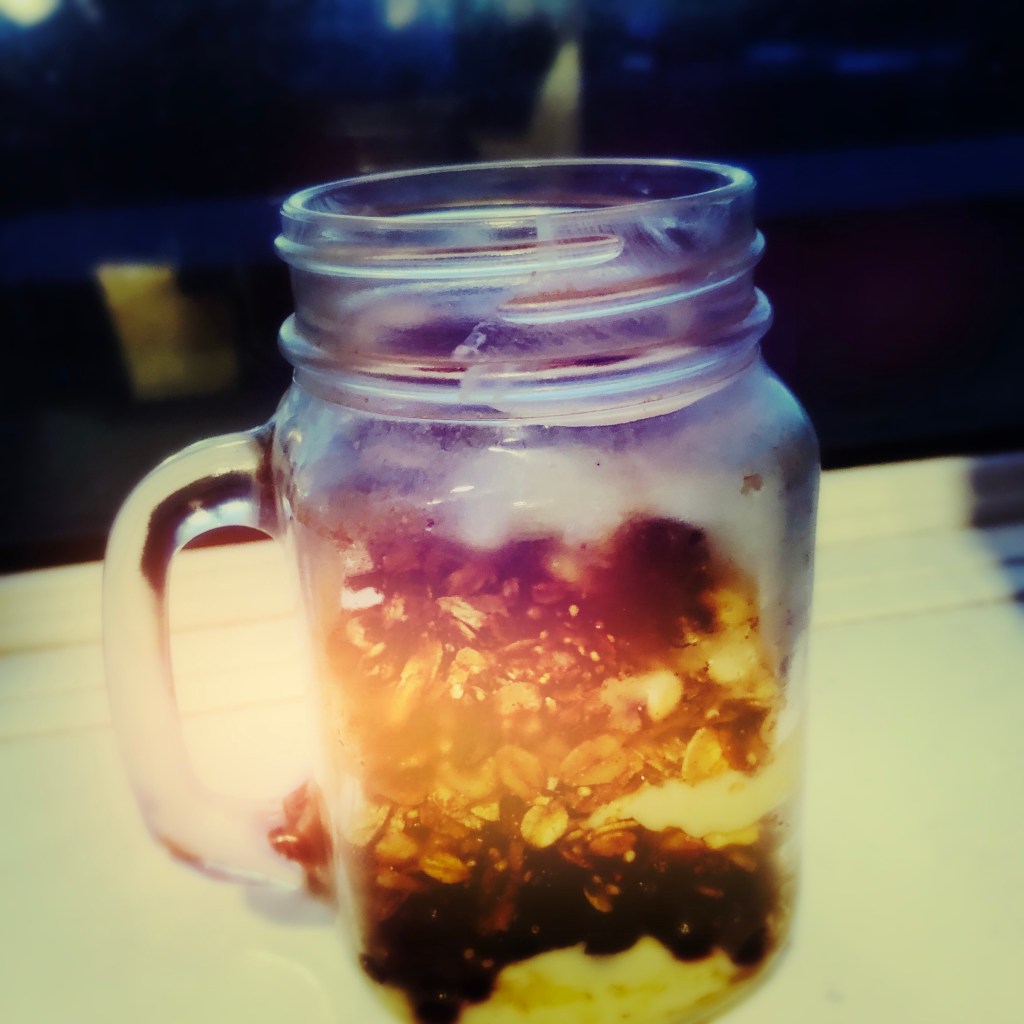 In a mason jar, layer 1/4 cup yogurt, then 1/4 wild blueberries, a handful of granola, another 1/4 cup of yogurt and top with 1/3 cup granola.