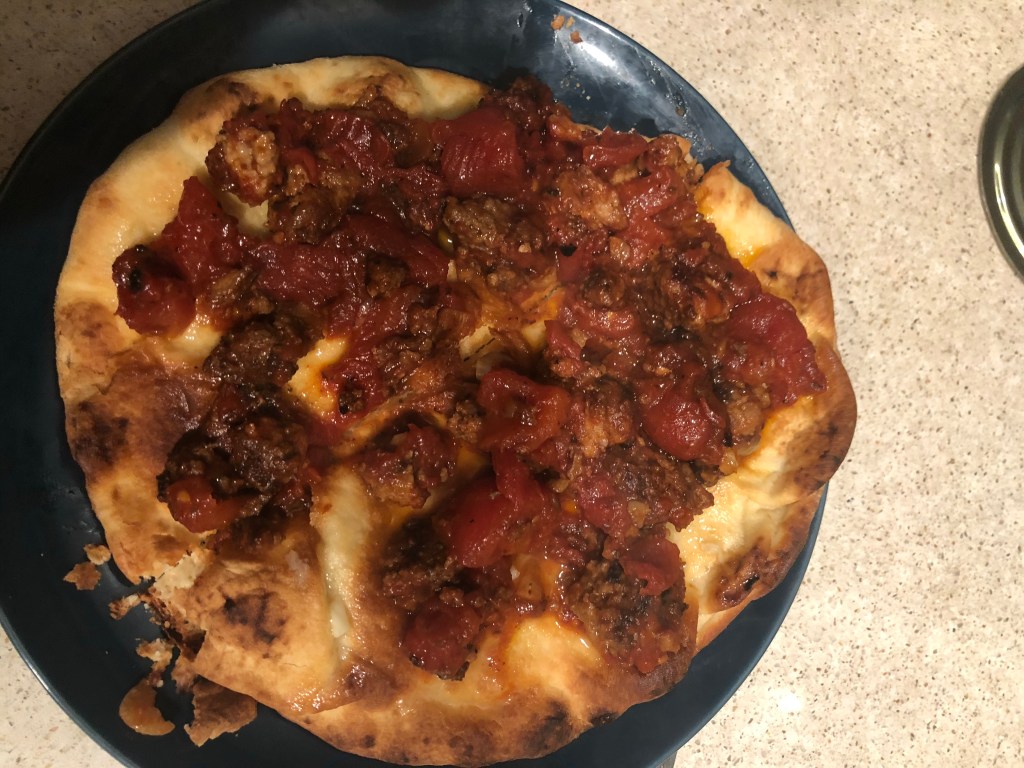 Next, heat up a store bought naan. You can heat until soft and warm, or toast if you like a crunchy crust. Top with meat mixture, and add a little salt.